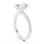 This sophisticated engagement ring features a striking Emerald-cut center diamond embraced by a delicate halo of brilliant round diamonds. The elongated step-cut facets of the emerald cut deliver unmatched elegance, clarity, and timeless refinement.