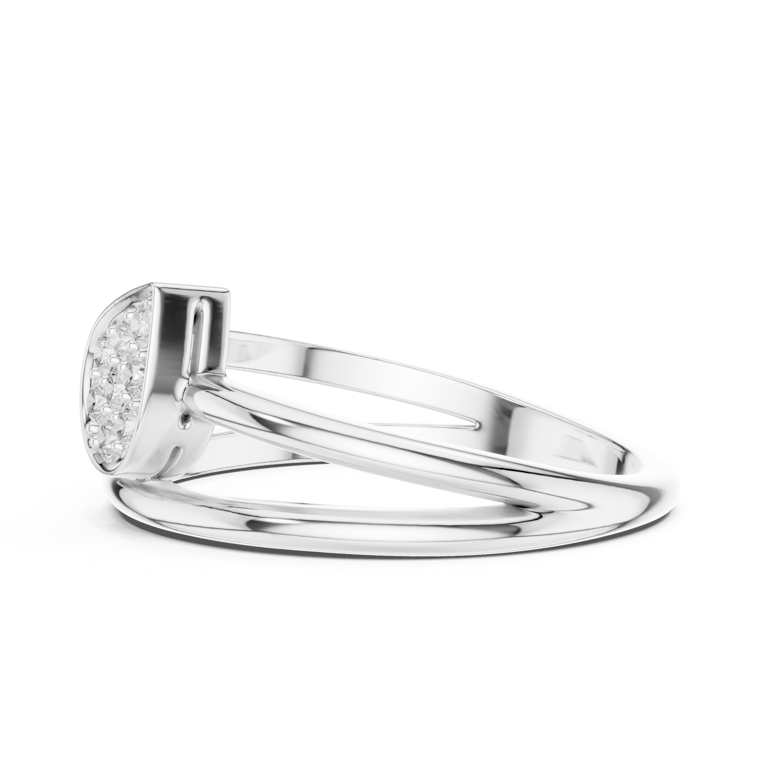 This elegant modern ring features a soft cushion-shaped pave diamond cluster delicately floating over a graceful split cathedral shank, creating a refined silhouette with minimal luxury appeal.