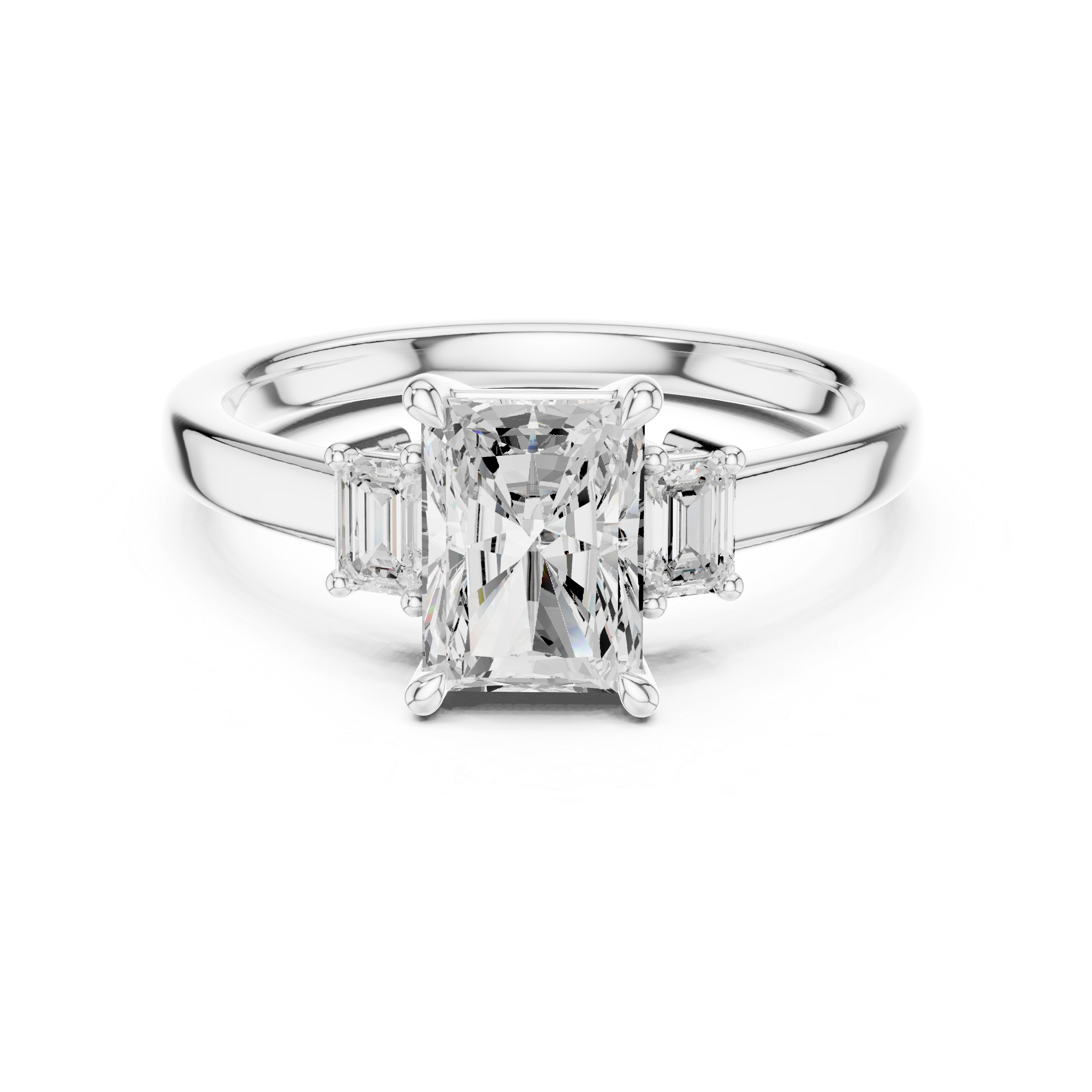 The unique sparkle of the radiant cut delivers a perfect blend of emerald-cut elegance and round-cut brilliance, while the trillion side stones add modern geometry and balance. The premium prong setting ensures maximum light exposure for outstanding brilliance and fire.