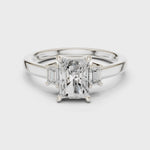 This luxurious engagement ring features a brilliant Radiant-cut center diamond beautifully accented by two sleek Trillion-cut side diamonds, forming a sophisticated three-stone design that symbolizes past, present & future.