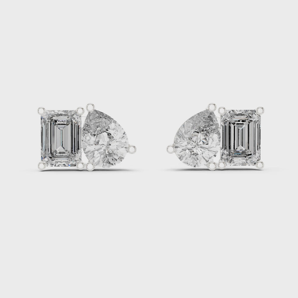 Make a bold and elegant statement with these exquisite Two-Stone Diamond Stud Earrings crafted with a striking combination of emerald cut and pear shaped diamonds. Designed to showcase brilliance from every angle, this contemporary twin-stone layout offers a refined balance of symmetry and modern luxury.